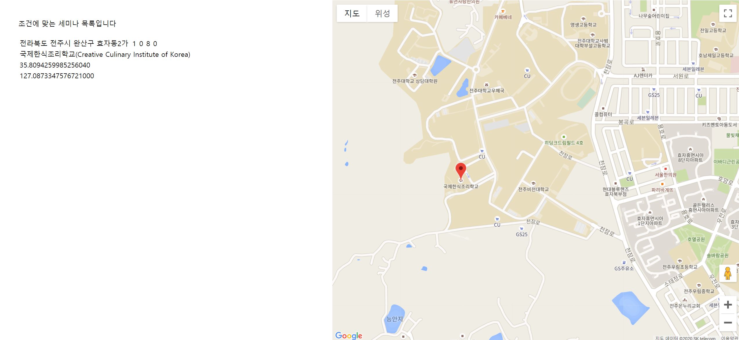 왼쪽에는 앞서 설정했었던 주소, 장소명, 위도, 경도 좌표가 출력되었고 (임의의 장소는 전주소재의 국제한식조리학교) 오른쪽에는 해당 위치가 구글 지도 마커를 통해 나타나고 있습니다.